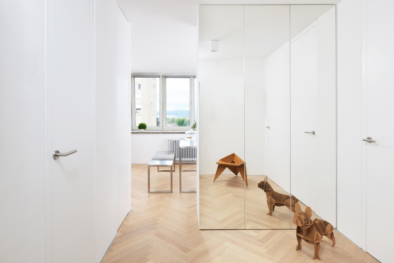 شبیه پر کردن دیوار، این فرمت آینه بزرگ کل سطح را می پوشاند. اما در این مورد، برای پوشاندن – و در عین حال مخفی کردن – کمد لباس یا فضاهای ذخیره سازی. از برخی جهات، افزودن یک سطح بازتابنده، فضای کمتری را که یک کمد نشان میدهد، کاهش میدهد و به درک یک اتاق بزرگتر کمک میکند (با این مزیت اضافه که کاربران را قادر میسازد تا به لباسهایشان نگاه کنند). کمدهای آینه ای مخصوصا برای اتاق خواب های کوچکتر که از این حس باز بودن و هوای مطبوع بهره می برند و همچنین برای پنهان کردن عناصر ذخیره سازی که ممکن است جریان بصری یا سبک یک فضا را مختل کنند مناسب است.