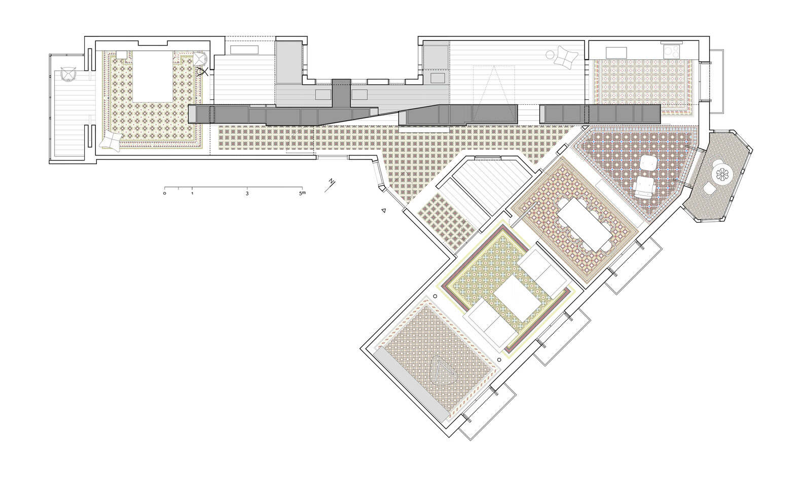 شایان ذکر است شباهت طرح موزاییک های هیدرولیک در برخی فضاها به طور کلی یا قسمت های خاص به فرش ها: یک بخش مرکزی که یک نقش را تشکیل می دهد، که با یک قاب بیرونی تکمیل می شود، که توسط کاشی های تک رنگ با رنگ های مشخص تشکیل شده است. این «فرشهای موزاییک» معمولاً در قسمتهایی مانند اتاق نشیمن، سالن و اتاق غذاخوری و گاهی در اتاقهای مخصوص میگذاشتند. در فضاهای فرعی، طرح موزاییک سادهتر بود.